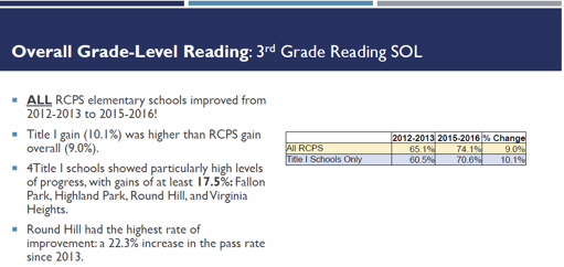 - 3rd Grade SOLS at all RCPS elementary schools improved from 2012-2013 to 2015-2016. Title I schools gain (10.1%) was higher than RCPS gain overall (9.0%). 4 Title I schools showed particularly high levels of progress, with gains of at least 17.5%.